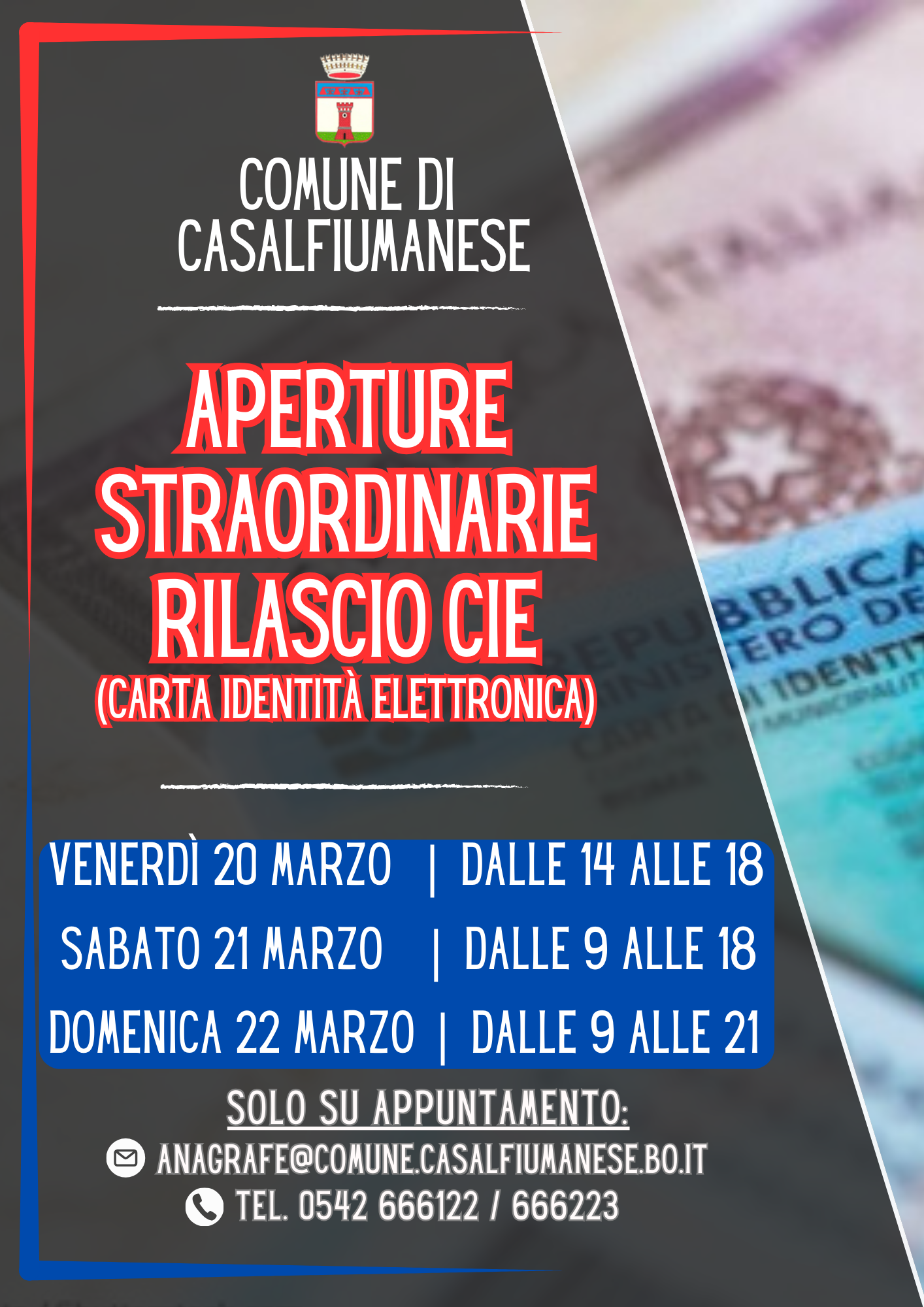 Il Comune di Casalfiumanese attiva aperture straordinarie dellโanagrafe per il rilascio della Carta dโIdentitร Elettronica (CIE), solo su appuntamento e riservate ai residenti nel Comune di Casalfiumanese.