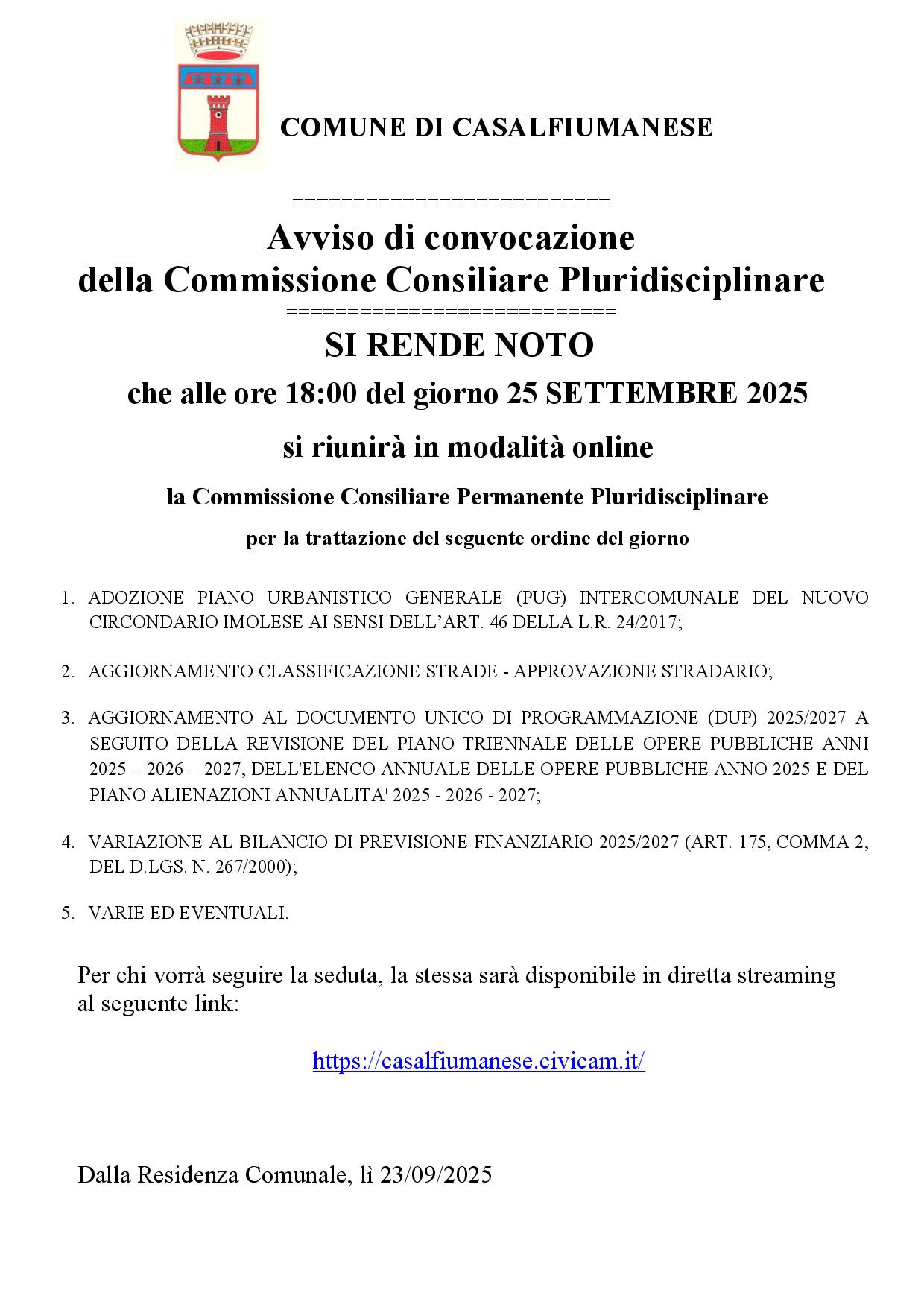 Si comunica che, giovedì 25 settembre 2025 alle ore 18.00 si terrà la seduta della commissione consiliare permanente pludisciplinare, in modalità online/videoconferenza.