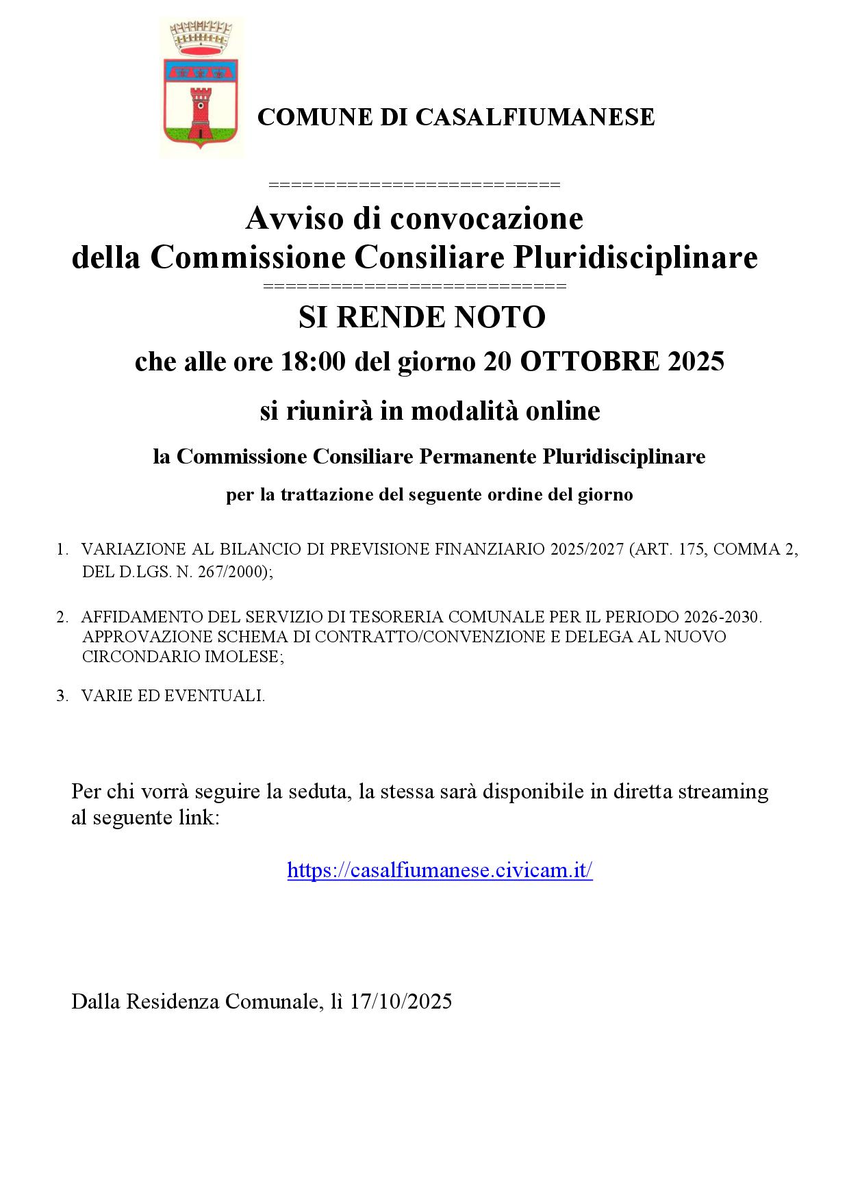 Si comunica che è convocata la Commissione Consiliare Pluridisciplinare per il giorno lunedì 20 ottobre 2025 ore 18.00 in modalità online/videoconferenza.