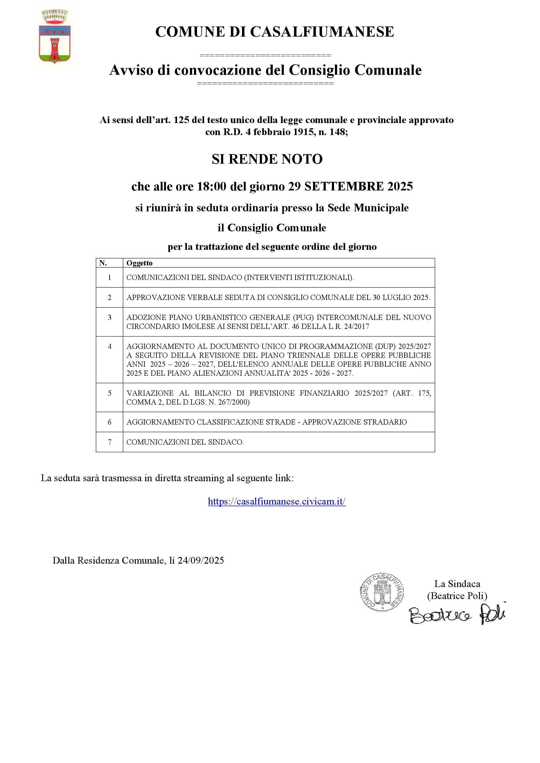 Si comunica che è convocato in sessione ordinaria - in presenza presso la Casa Comunale- il Consiglio Comunale per il giorno 29 SETTEMBRE 2025 alle ore 18:00