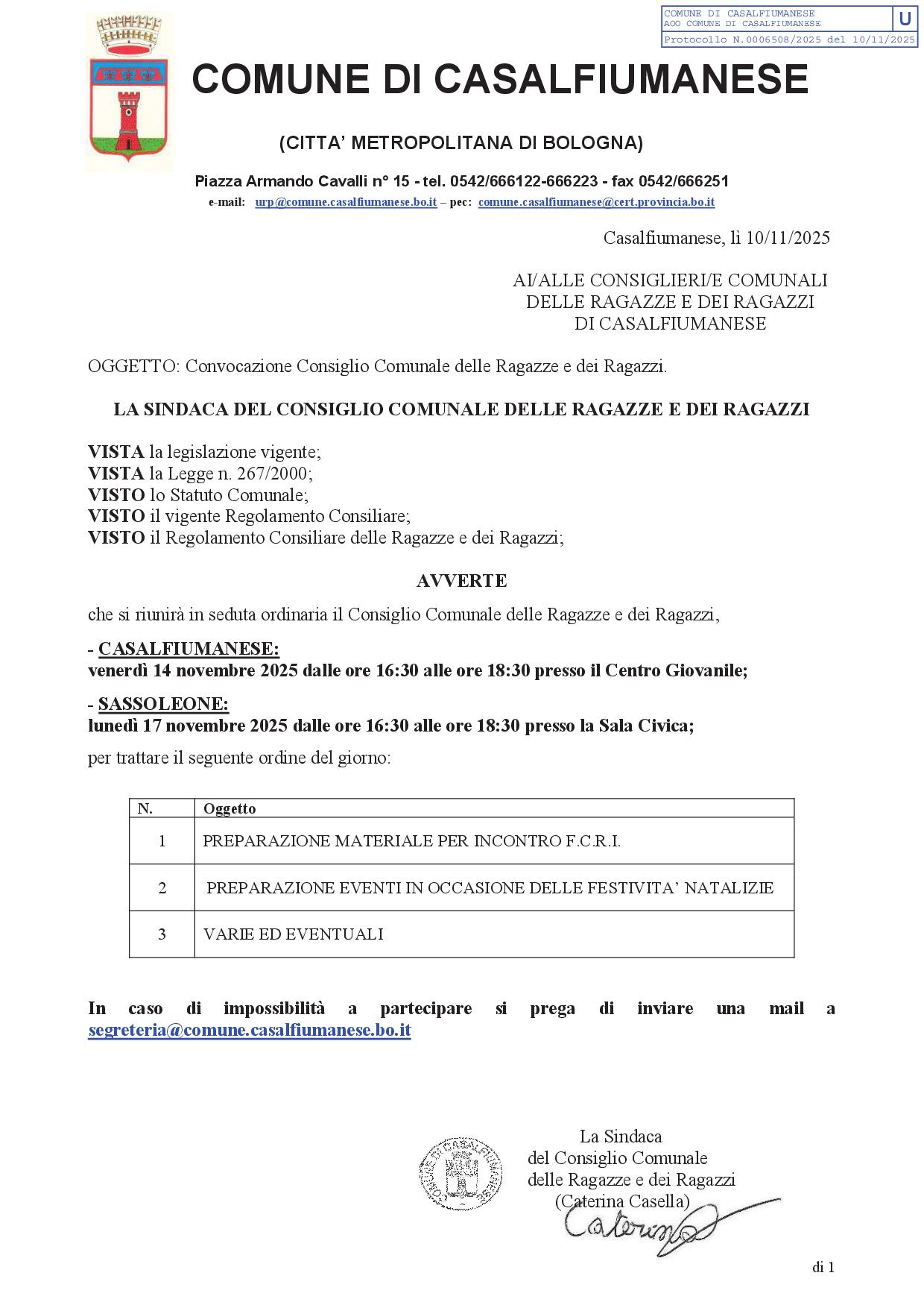 Si comunica che è convocata, in seduta ordinaria, la prossima seduta del Consiglio Comunale delle Ragazze e dei Ragazzi di Casalfiumanese: