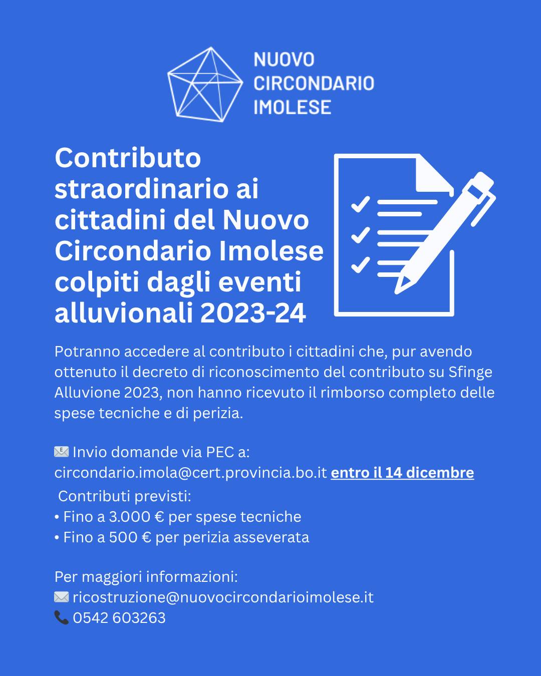 Il Nuovo Circondario Imolese informa che, a partire dalle ore 9:00 di lunedì 6 ottobre 2025, sarà possibile presentare domanda per accedere ad un contributo straordinario destinato ai cittadini dei Comuni del Circondario colpiti dagli eventi alluvionali e franosi di maggio 2023 e settembre-ottobre 2024.