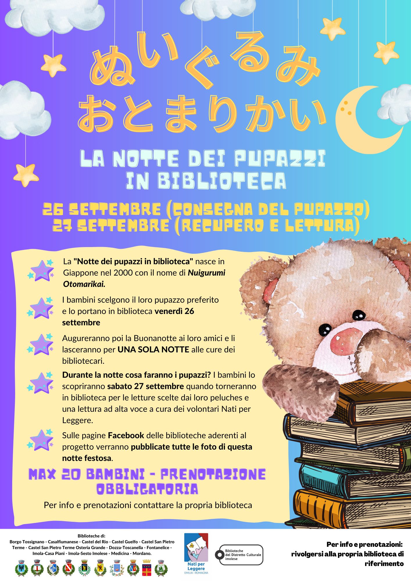 Le biblioteche del Nuovo Circondario Imolese propongono, per il terzo anno consecutivo, l’iniziativa “La Notte dei Pupazzi”, che si terrà nelle giornate di venerdì 26 e sabato 27 settembre 2025 presso tutte le biblioteche dei Comuni aderenti.