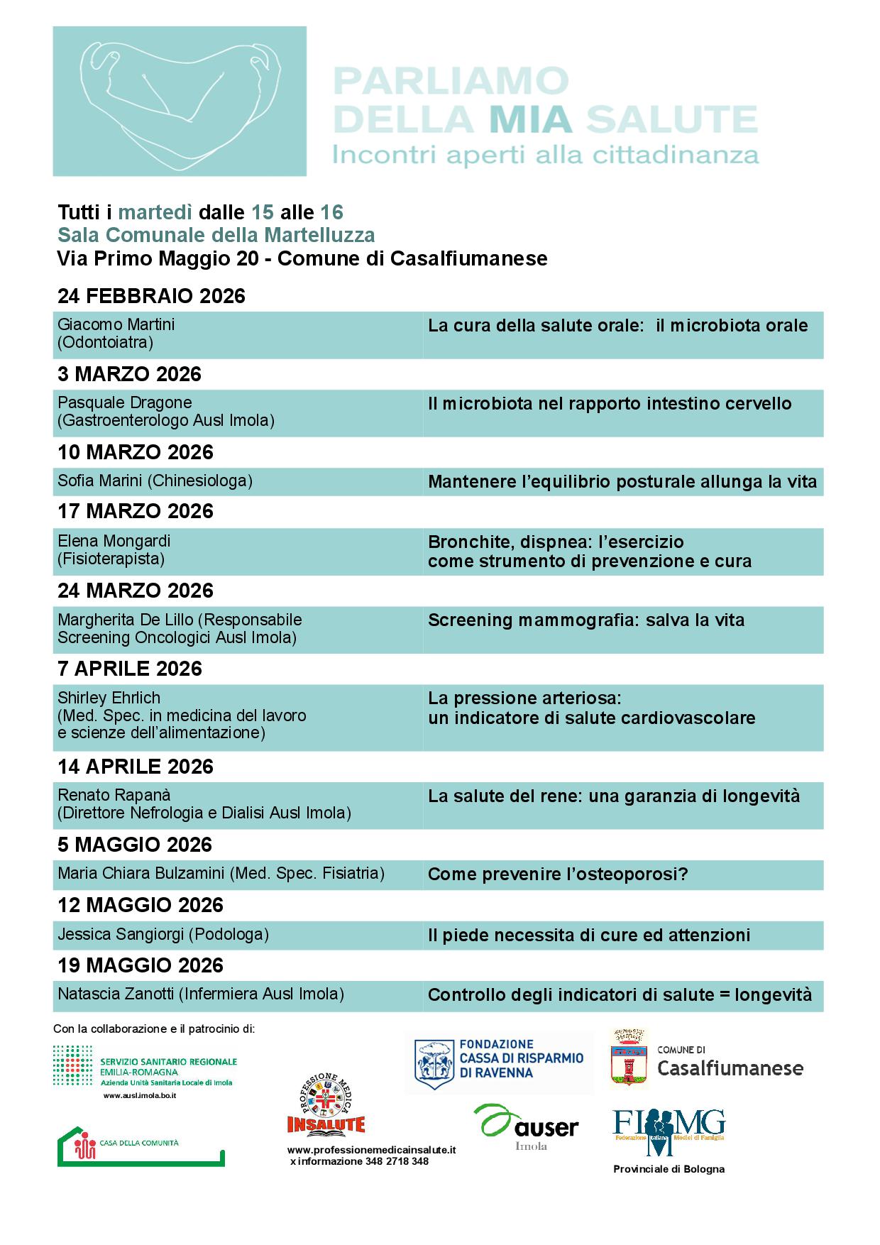 Si parte il 24 febbraio insieme all’odontoiatra Giacomo Martini per analizzare il tema della cura della salute orale. Gli incontri gratuiti, promossi dall’amministrazione comunale in stretta sinergia con Ausl Imola, Insalute, Auser, Fimg Bologna e sostenuti dalla Fondazione Cassa di Risparmio di Ravenna, proseguiranno a cadenza regolare fino al 19 maggio.