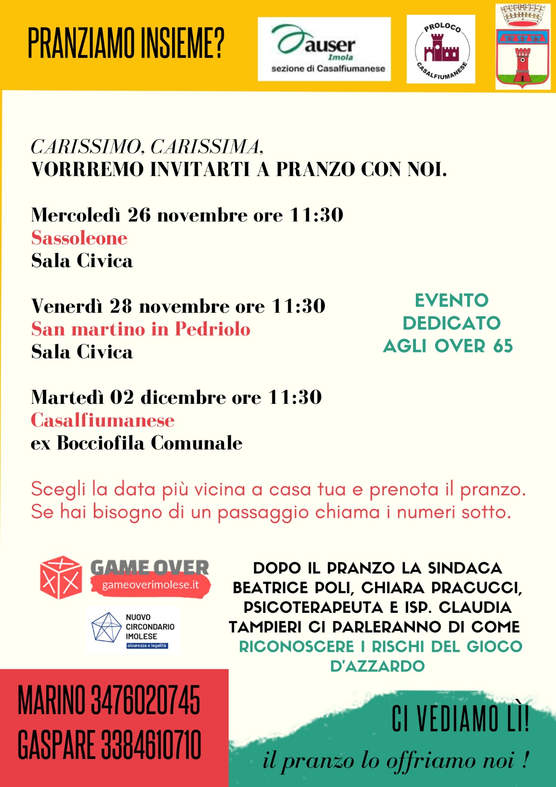 Dopo il gradimento registrato nelle passate edizioni, a Casalfiumanse si rinnova l'iniziativa sociale 'Pranziamo Insieme?' promossa dall'amministrazione comunale insieme alla sezione locale di Auser e alla Pro Loco.