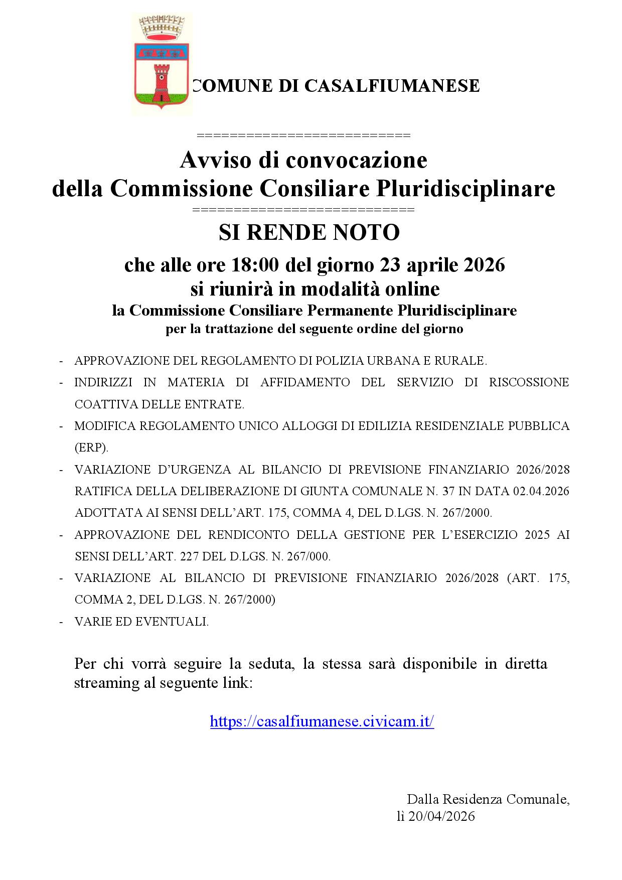 Si comunica che è convocata la Commissione Consiliare Pluridisciplinare per il giorno: