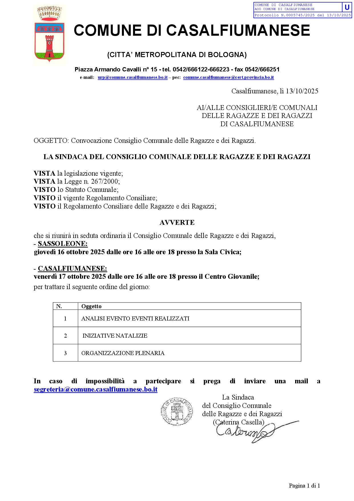 Si comunica che è convocata, in seduta ordinaria, la prossima seduta del Consiglio Comunale delle Ragazze e dei Ragazzi di Casalfiumanese: