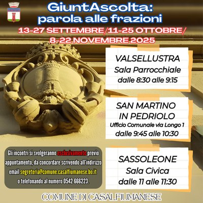 Dopo i consensi in termini di partecipazione registrati nei mesi scorsi, gli incontri di '𝐆𝐢𝐮𝐧𝐭𝐀𝐬𝐜𝐨𝐥𝐭𝐚: 𝐩𝐚𝐫𝐨𝐥𝐚 𝐚𝐥𝐥𝐞 𝐟𝐫𝐚𝐳𝐢𝐨𝐧𝐢', opportunità fortemente voluta dall’amministrazione di Casalfiumanese per alimentare il confronto con i residenti nelle zone più distaccate del territorio comunale, continuano anche nei mesi di settembre, ottobre e novembre.