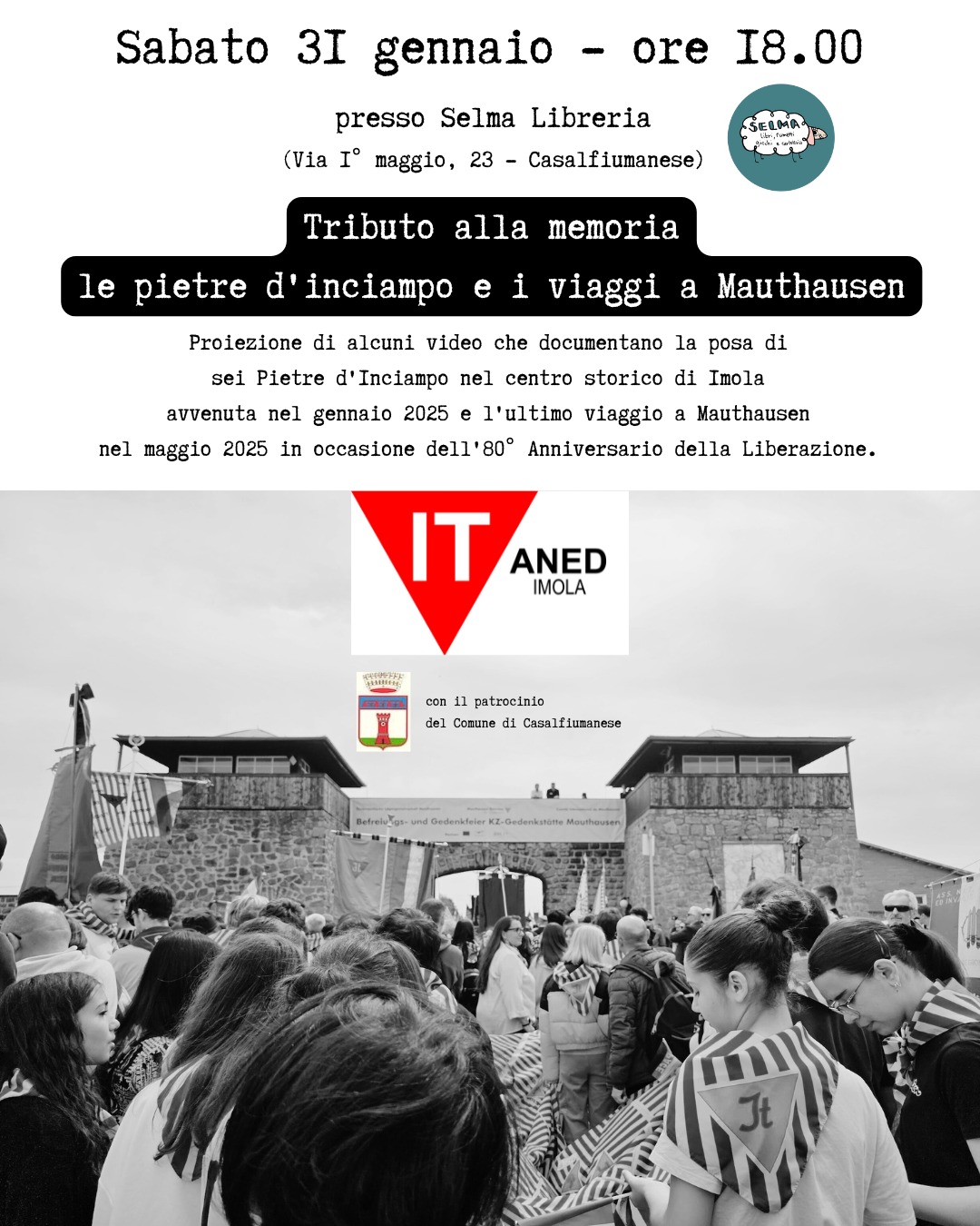 Sabato 31 gennaio, alle ore 18.00, presso Selma Libreria (via I° Maggio 23, Casalfiumanese), si terrà l’iniziativa “Tributo alla memoria: le pietre d’inciampo e i viaggi a Mauthausen”, un momento di riflessione e approfondimento dedicato alla memoria della deportazione e della Shoah.