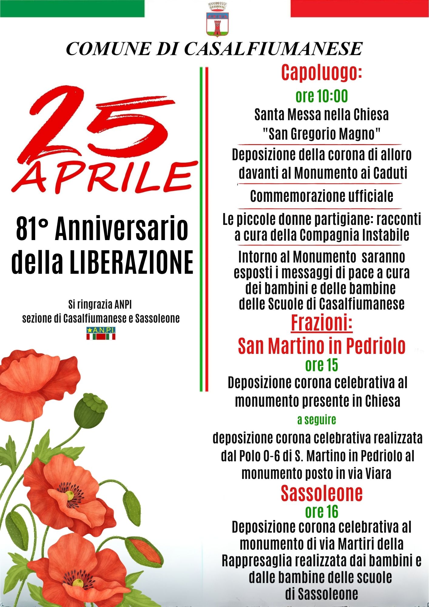 Il Comune di 𝐂𝐚𝐬𝐚𝐥𝐟𝐢𝐮𝐦𝐚𝐧𝐞𝐬𝐞 invita tutta la cittadinanza a partecipare alle celebrazioni per l’𝟖𝟏° 𝐀𝐧𝐧𝐢𝐯𝐞𝐫𝐬𝐚𝐫𝐢𝐨 𝐝𝐞𝐥𝐥𝐚 𝐋𝐢𝐛𝐞𝐫𝐚𝐳𝐢𝐨𝐧𝐞, un momento fondamentale per onorare la memoria di chi ha lottato per la nostra libertà e per riaffermare i valori di democrazia e pace.