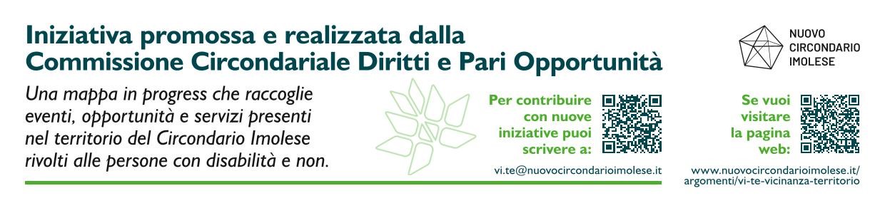 Ne è nato “VI.TE. Vicinanza Territorio – Mappa delle opportunità”, un progetto in progress, che trova spazio nel sito del Nuovo Circondario Imolese (www.nuovocircondarioimolese.it/argomenti/vi-te-vicinanza-territorio), fornendo a tutti i cittadini e le cittadine i riferimenti di attività e eventi accessibili/dedicati alle persone con disabilità, selezionabile per Comune o per attività e con indicato eventuali costi e siti di approfondimenti.