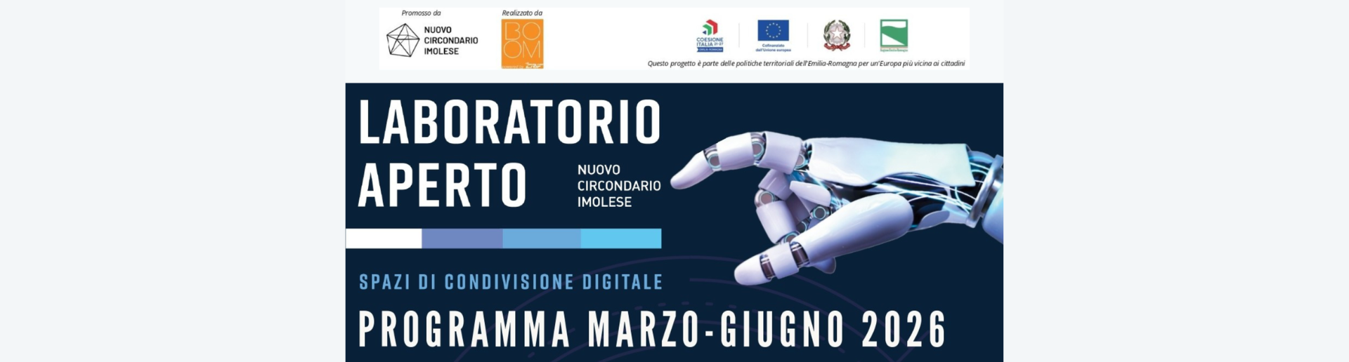 Prende il via la terza edizione del progetto Laboratorio Aperto del Nuovo Circondario Imolese, iniziativa finanziata con risorse FESR 2021/27 e inserita in ATUSS, concepita come spazio di divulgazione e approfondimento su intelligenza artificiale, innovazione e competenze digitali rivolto a imprese, cittadini e scuole.