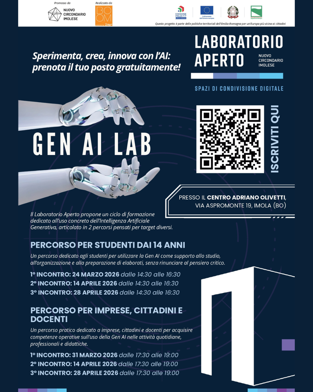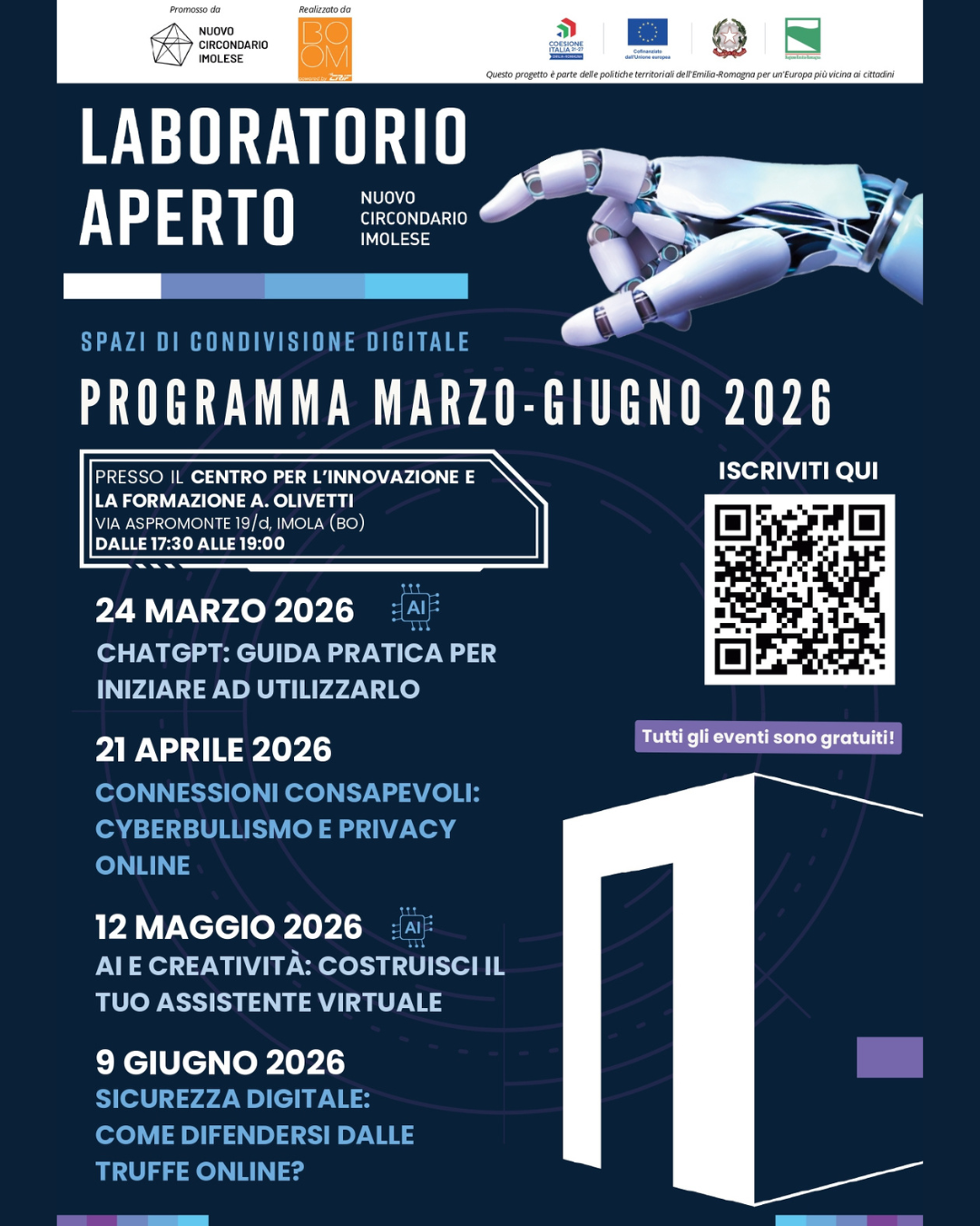 Tutti gli eventi divulgativi e i percorsi formativi si svolgeranno presso il Centro per la Formazione e l'Innovazione Adriano Olivetti di Imola (Via Aspromonte 19/d ) e saranno gratuiti, previa apposita iscrizione tramite il seguente form online: