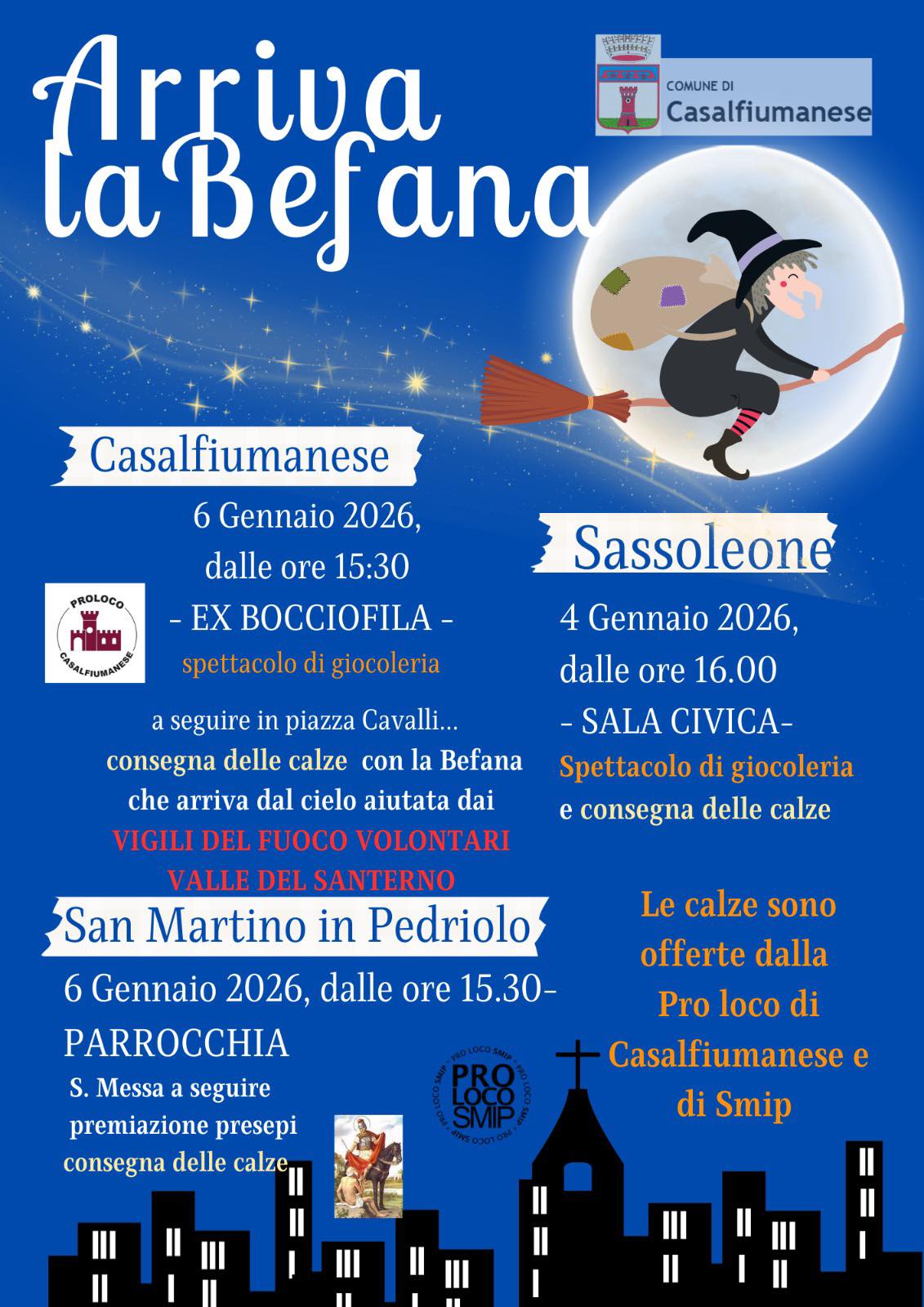 Il Comune di Casalfiumanese, insieme alle associazioni del territorio, è lieto di invitare grandi e piccini agli appuntamenti dedicati alla Befana 2026
