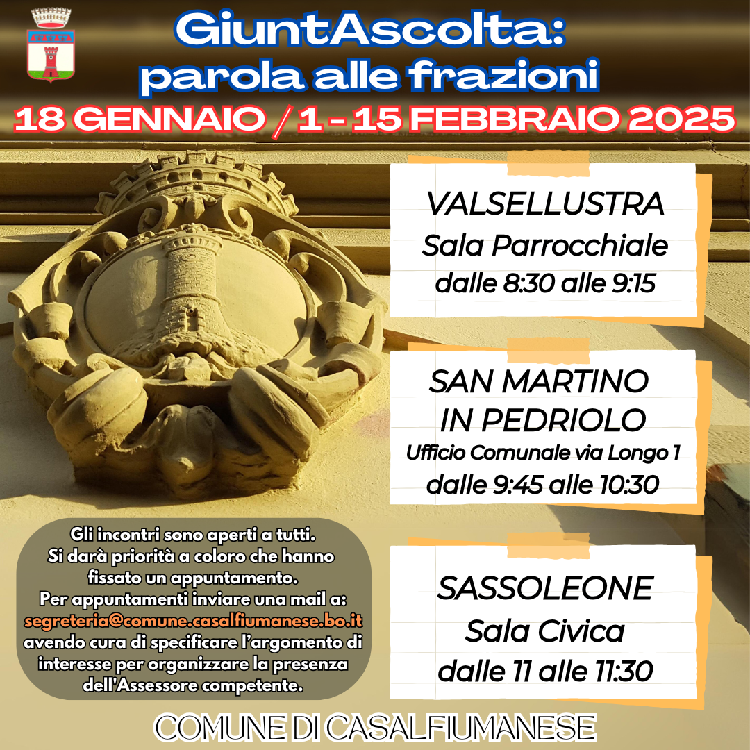 Gli incontri sono aperti a tutti con priorità a coloro che avranno fissato un appuntamento tramite mail (segreteria@comune.casalfiumanese.bo.it) specificando l'argomento di interesse per organizzare la presenza dell'assessore competente.