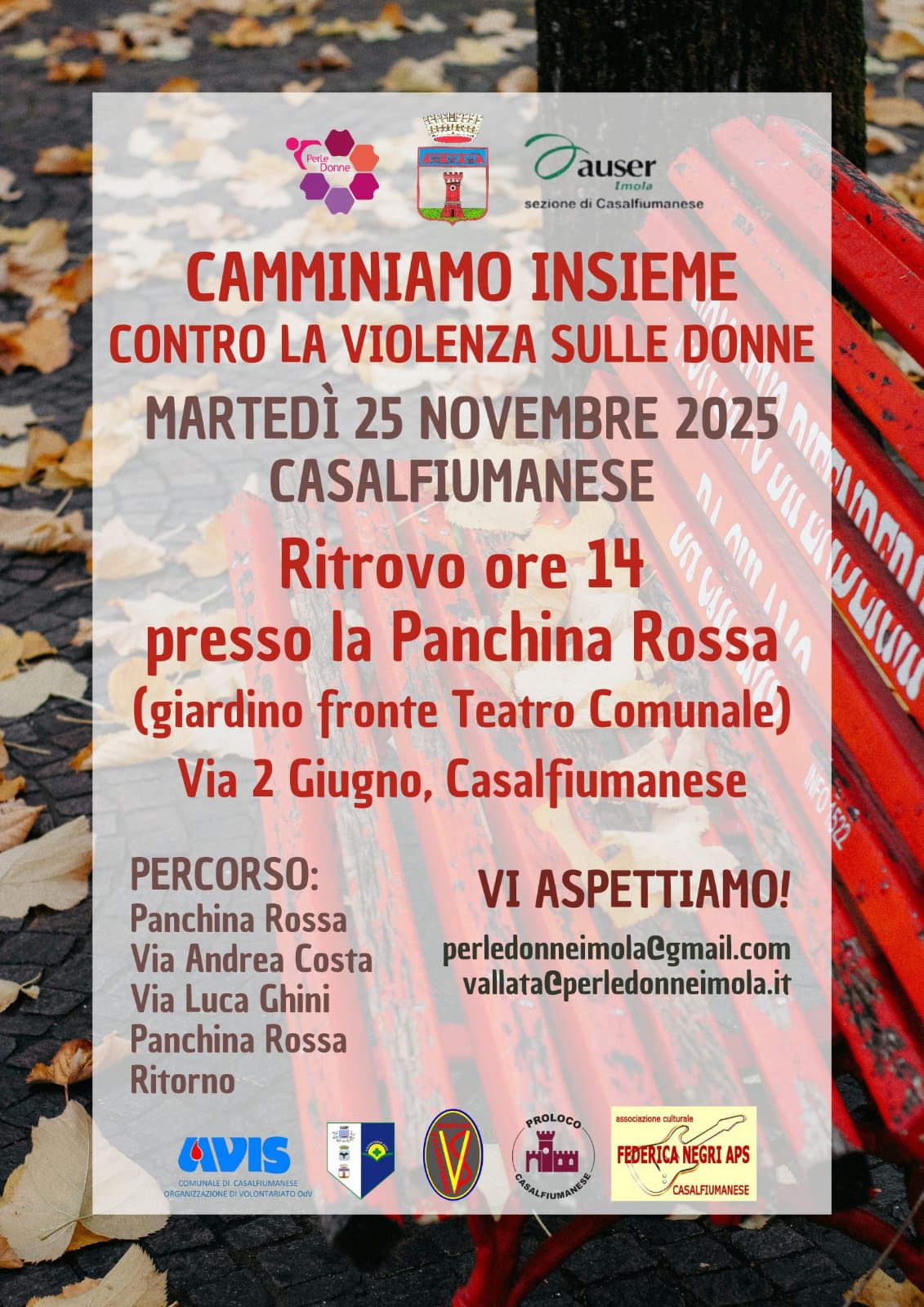 Ritrovo alla Panchina Rossa (giardino fronte Teatro Comunale, Via 2 Giugno).Un percorso simbolico attraverso il paese per dire insieme 𝗡𝗢 𝗮𝗹𝗹𝗮 𝘃𝗶𝗼𝗹𝗲𝗻𝘇𝗮 𝘀𝘂𝗹𝗹𝗲 𝗱𝗼𝗻𝗻𝗲 e ricordare che la presenza della comunità è fondamentale.Iniziativa realizzata con la collaborazione di AUSER IMOLA, dell’associazione Associazione PerLeDonne e delle associazioni del territorio, che ringraziamo per aver organizzato questo appuntamento.