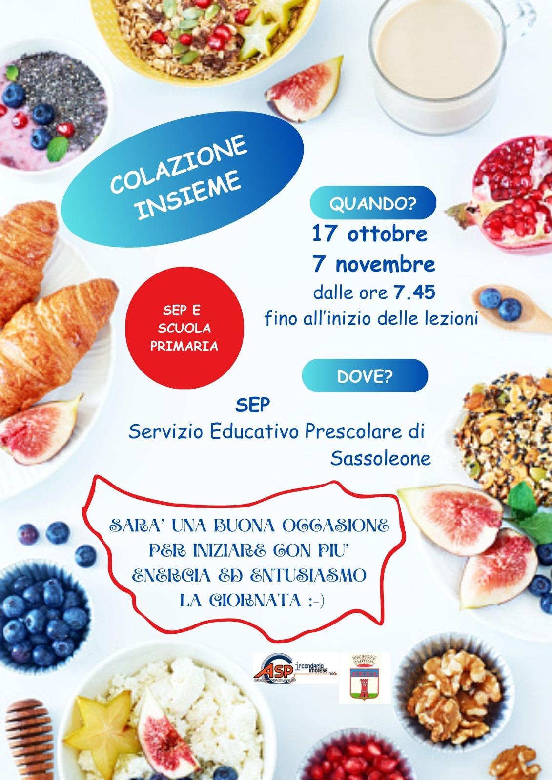 𝐈𝐥 𝟏𝟕 𝐨𝐭𝐭𝐨𝐛𝐫𝐞 𝐞 𝐢𝐥 𝟕 𝐧𝐨𝐯𝐞𝐦𝐛𝐫𝐞, 𝐝𝐚𝐥𝐥𝐞 𝐨𝐫𝐞 𝟕.𝟒𝟓 fino all’inizio delle lezioni presso gli spazi del Servizio Educativo Prescolare di Sassoleone in via Martiri della Rappresaglia, torna l’appuntamento con ‘Colazione Insieme’.